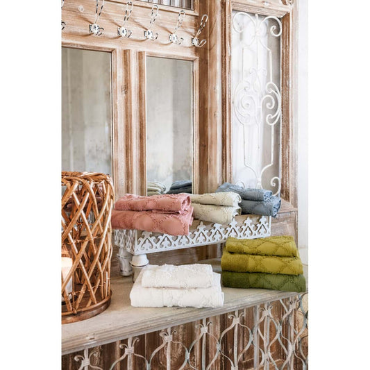Telo bagno beige e verde con balza in lino 90x150h| Blanc Mariclò