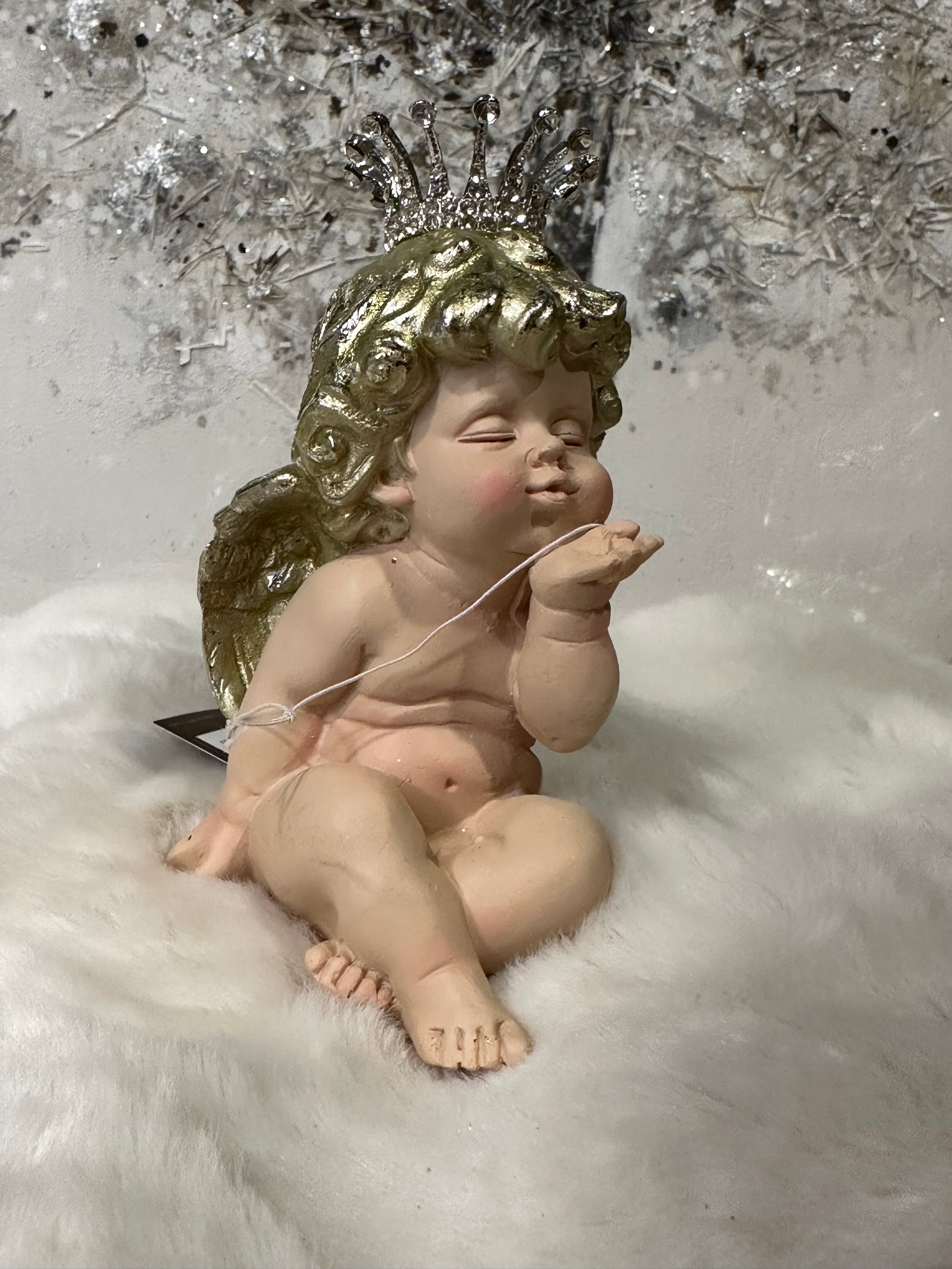Angeli in resina in posa diversa. Gli angeli, con i loro tratti delicati e dettagliati, indossano corone argento che aggiungono un tocco di regalità. Due degli angeli sono in atteggiamento pensieroso e riflessivo, mentre il terzo angelo tiene tra le mani un cuore dorato, simbolo di amore e affetto. Questi angeli decorativi sono perfetti per arricchire l'arredamento durante le festività o per una disposizione tematica dedicata all'armonia e alla serenità.