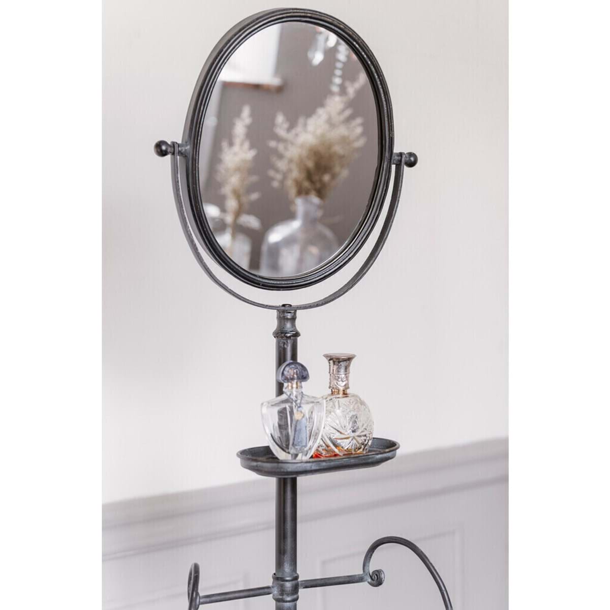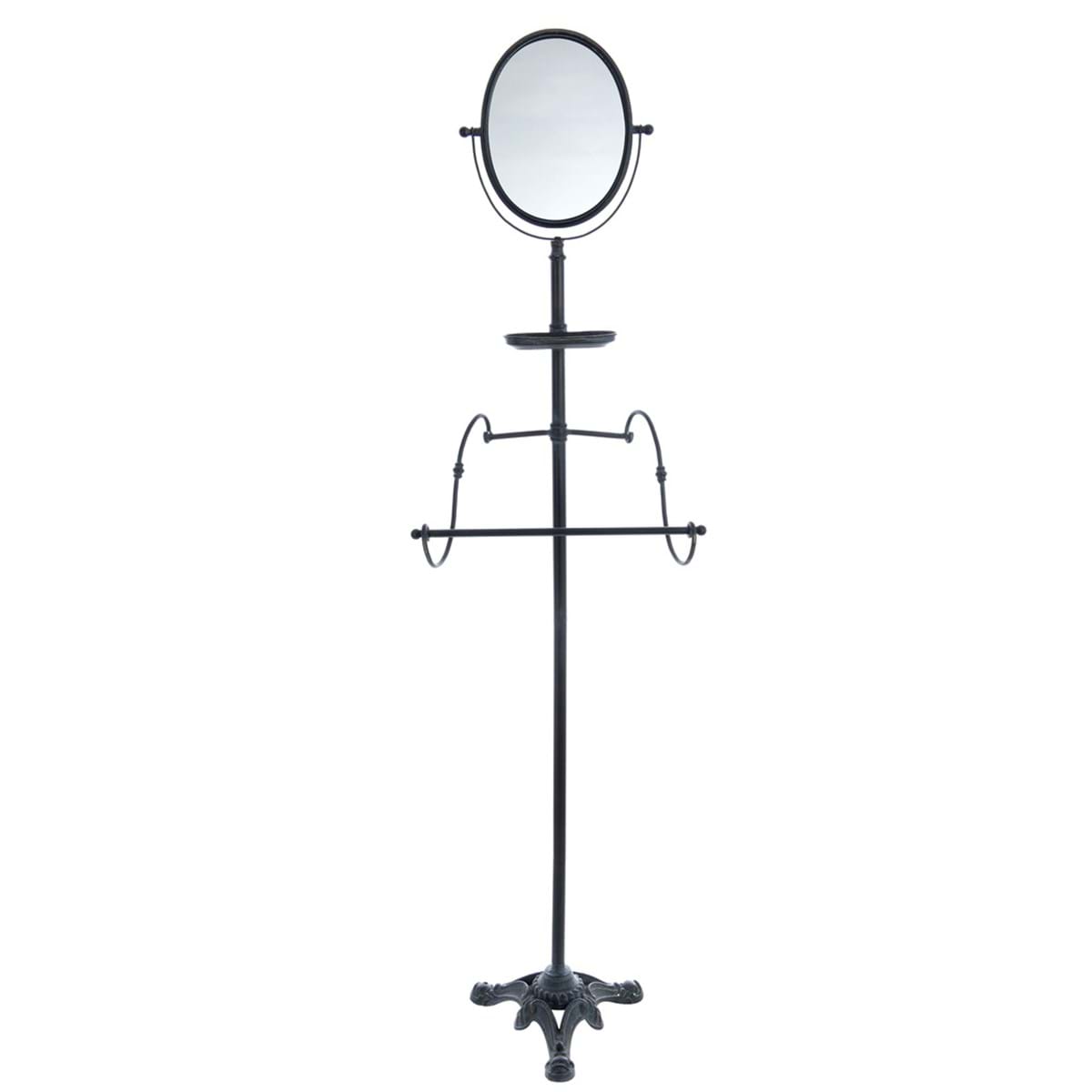 Originale appendi oggetti da terra con specchio integrato, dal design classico e funzionale. La struttura, in metallo nero, è caratterizzata da una base stabile con dettagli decorativi e un'asta centrale alta e sottile. Lo specchio ovale, posizionato nella parte superiore, è regolabile. Sotto lo specchio, troviamo una mensola per piccoli oggetti e due bracci laterali che possono essere utilizzati per appendere oggetti.