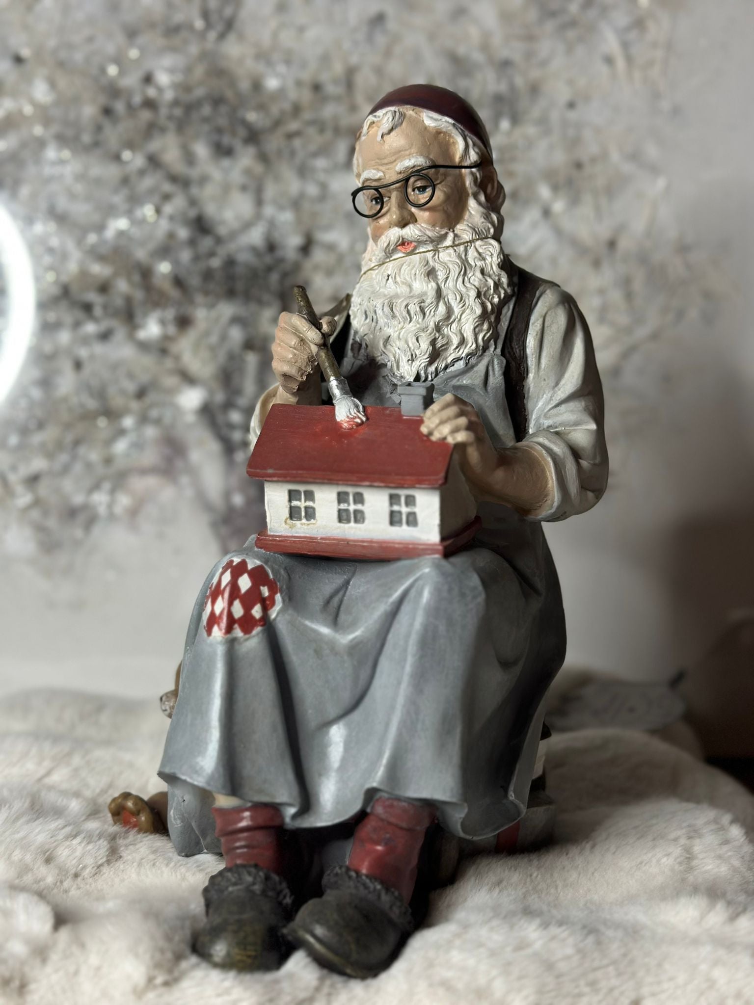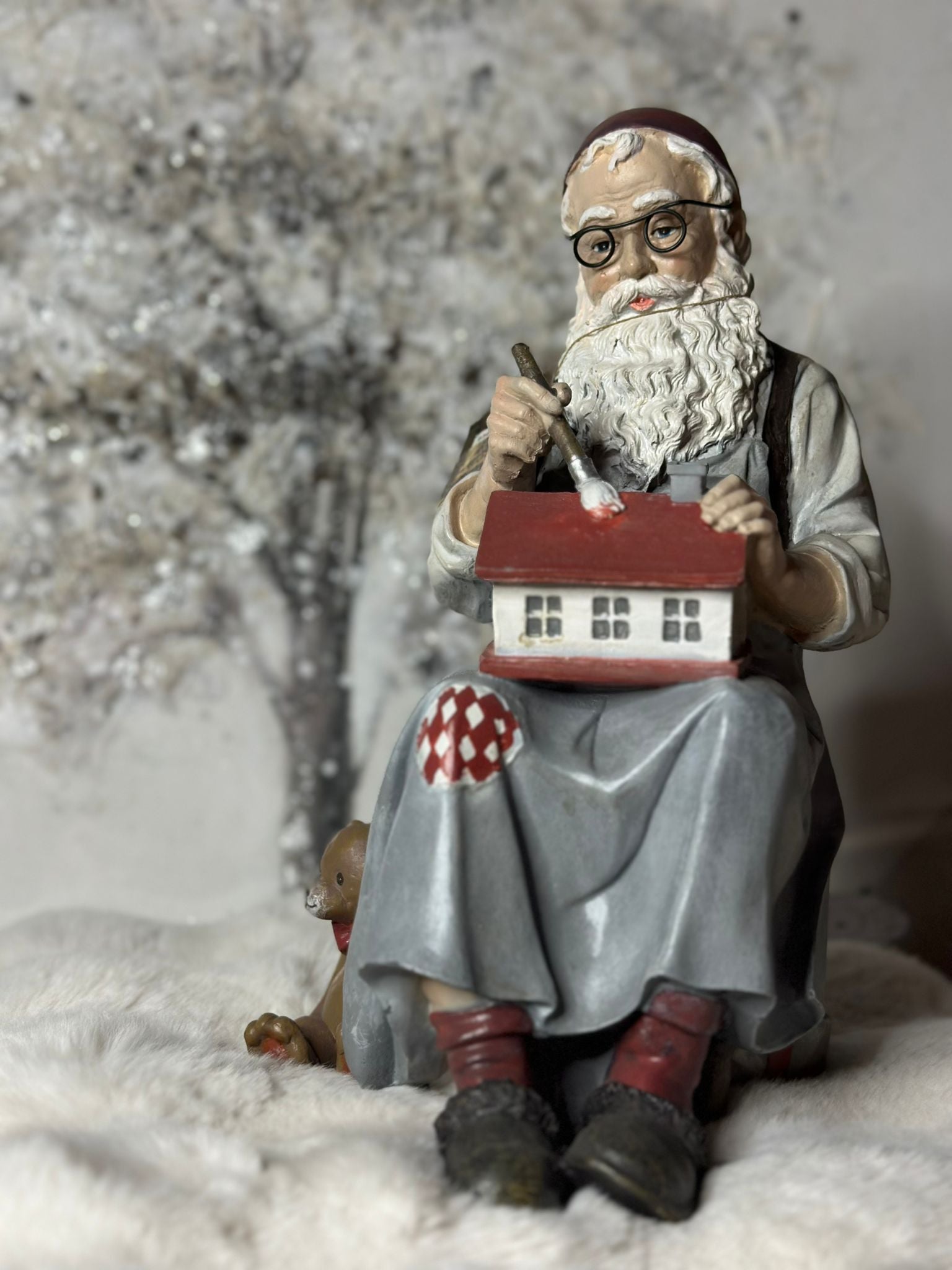 Perfetto per decorare la tua casa durante le festività natalizie, questo Babbo Natale in resina è l'elemento ideale per aggiungere un tocco di magia al tuo ambiente. Raffigurato mentre dipinge una casetta di legno, indossa un abito tradizionale con dettagli curati e colori vivaci. La figura è seduta su uno sgabello con un orsetto a fianco e dei pacchi regalo. Realizzato con un'attenzione minuziosa ai dettagli, questo ornamento si distingue per la sua bellezza e la sua originalità.