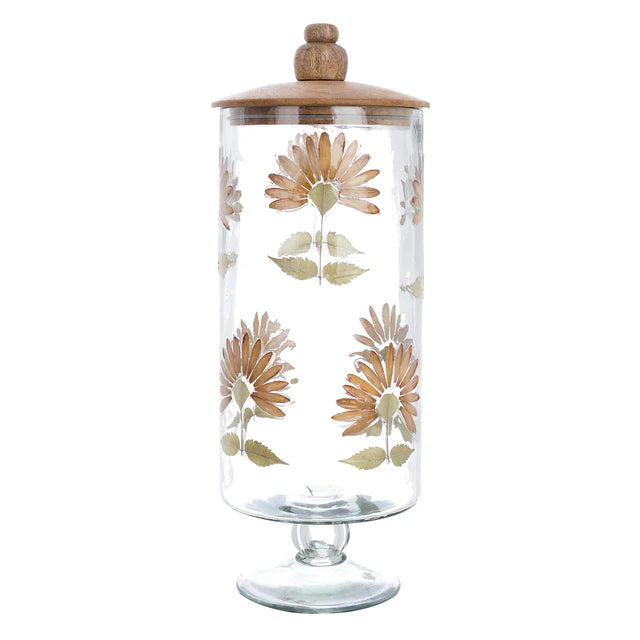 Barattolo in vetro su piedistallo arricchito da fiori essiccati, ideale per creare un'atmosfera romantica e naturale. Il coperchio in legno aggiunge un tocco rustico, rendendolo perfetto per la cucina o il soggiorno di una casa accogliente e raffinata.