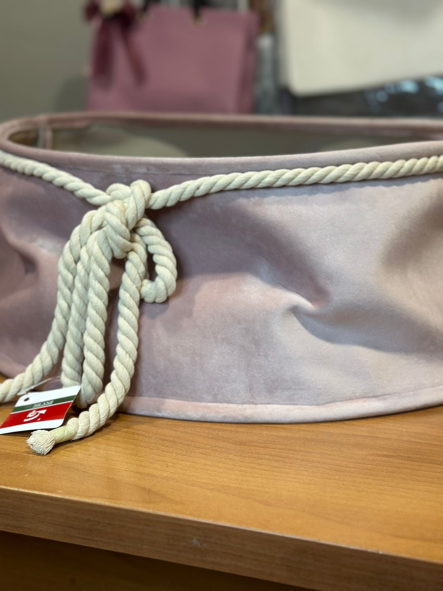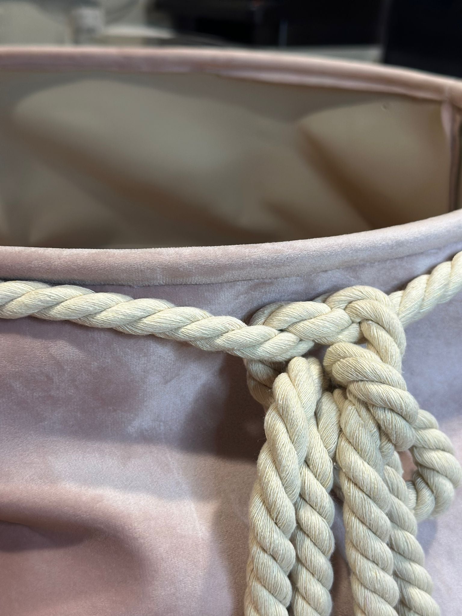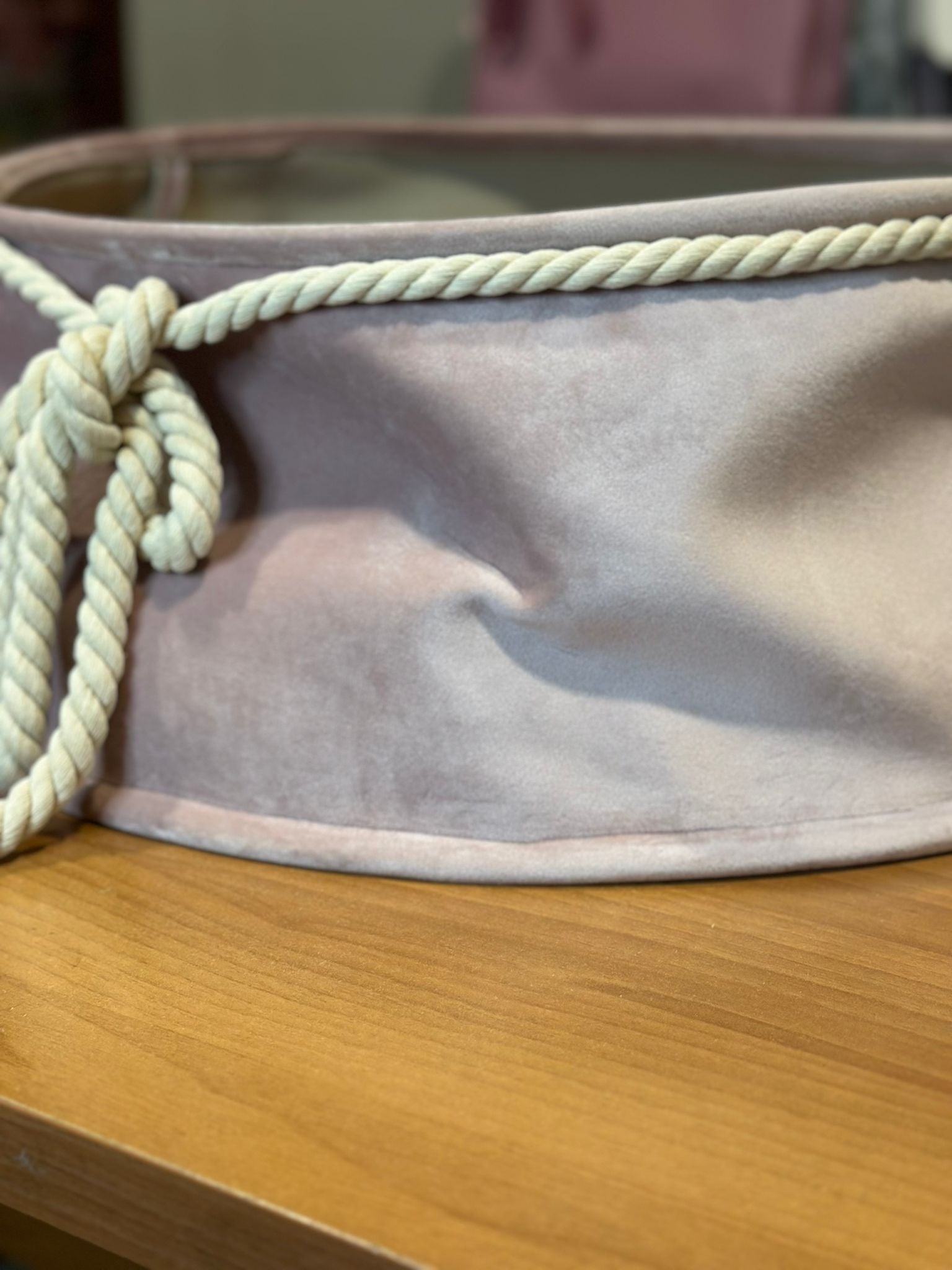 Questa è una base per albero di Natale, realizzata in un tessuto morbido e vellutato di colore rosa tenue. La struttura è circolare e presenta una consistenza soffice, ideale per nascondere la base dell'albero in modo elegante. Intorno alla parte superiore della base, è legata una corda spessa di colore avorio, annodata al centro in uno stile semplice ma decorativo, conferendo un tocco rustico e artigianale. La corda funge sia da elemento estetico che funzionale, aggiungendo carattere e contrasto al tessuto liscio e delicato. Questa base è perfetta per chi cerca un modo elegante e raffinato per completare la decorazione natalizia, mascherando la struttura alla base dell'albero.