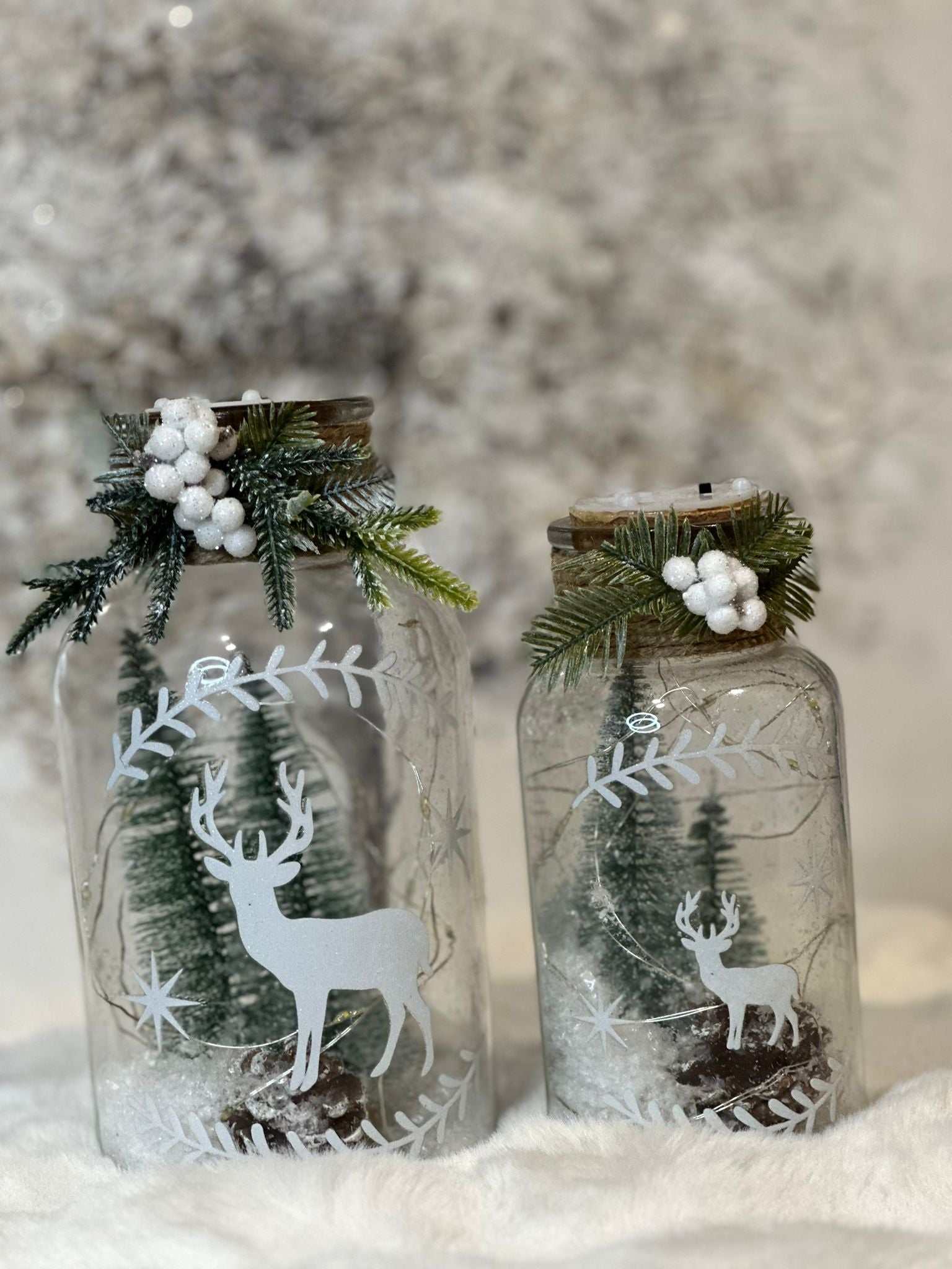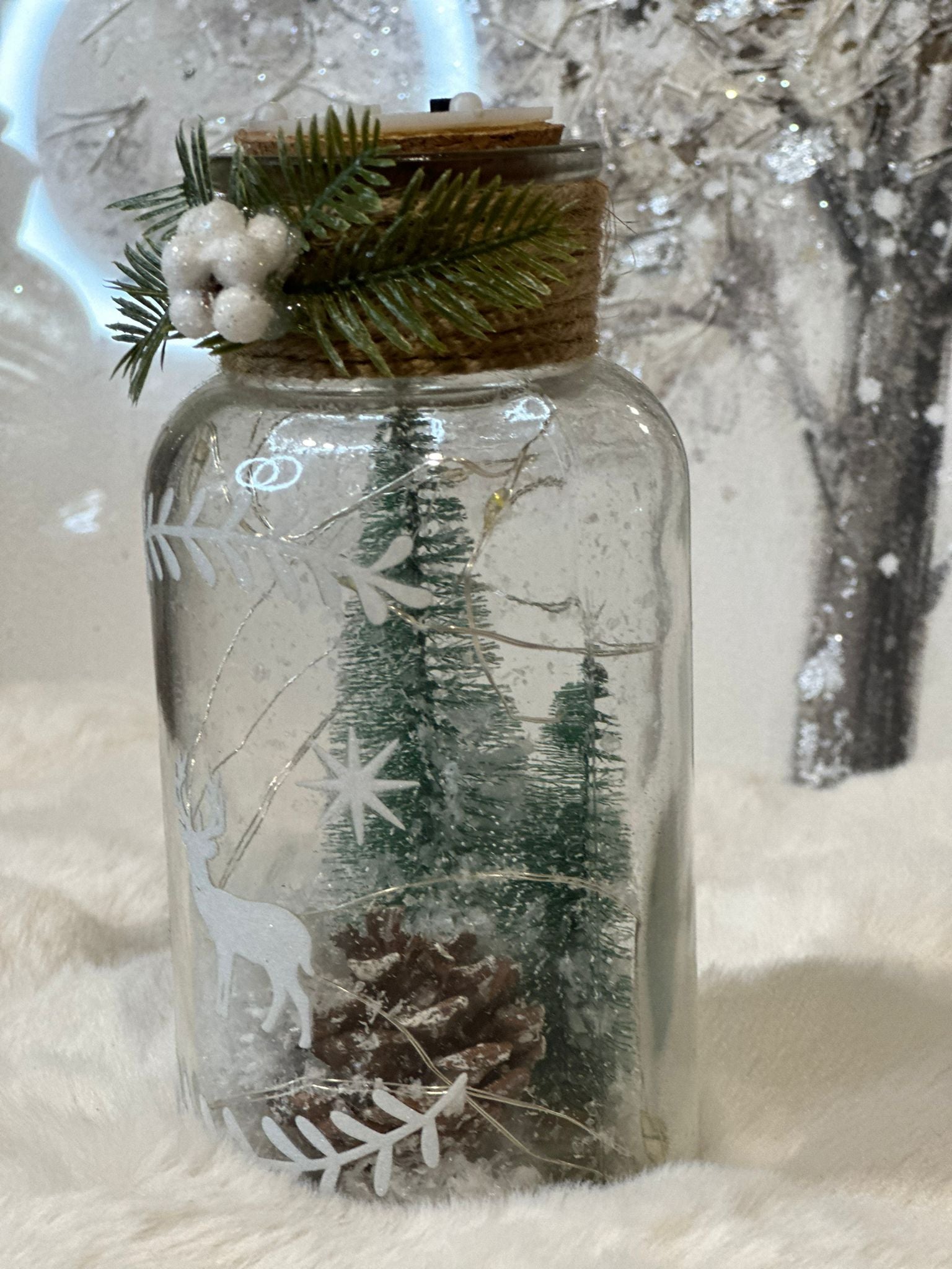 La superficie esterna di ciascuna bottiglia è decorata con un'immagine di cervo bianco stilizzato, incorniciato da motivi vegetali e stelle, che contribuiscono a creare un'atmosfera natalizia e naturale. All'interno, si possono vedere lucine led ed alberelli di pino innevati. I coperchi sono abbelliti con ramoscelli di pino sintetici e piccoli grappoli di bacche bianche, che sono legati intorno al bordo superiore, creando un effetto rustico e naturale. Questa decorazione vegetale aggiunge un ulteriore tocco natalizio ai barattoli, richiamando la bellezza della natura in inverno.