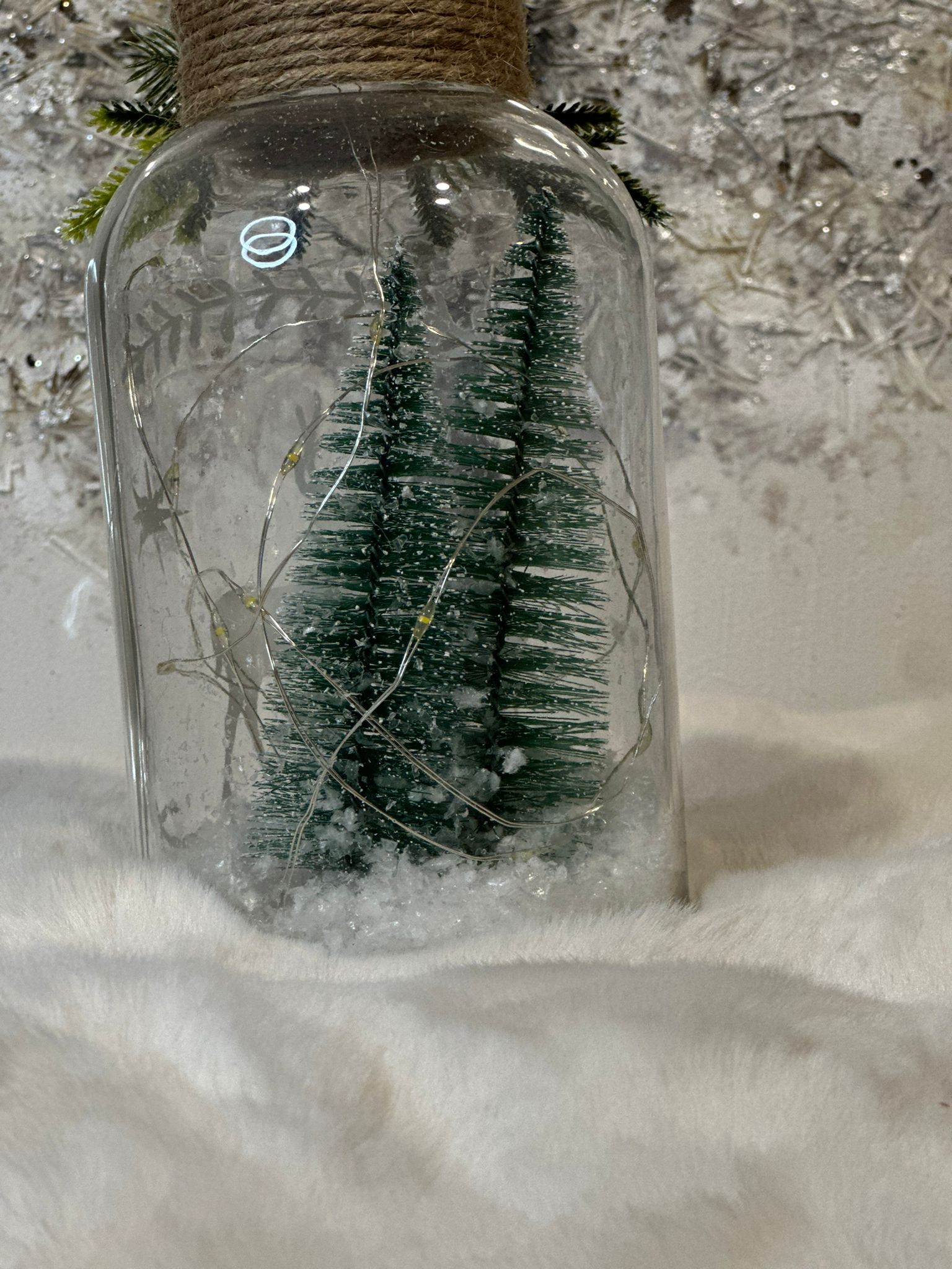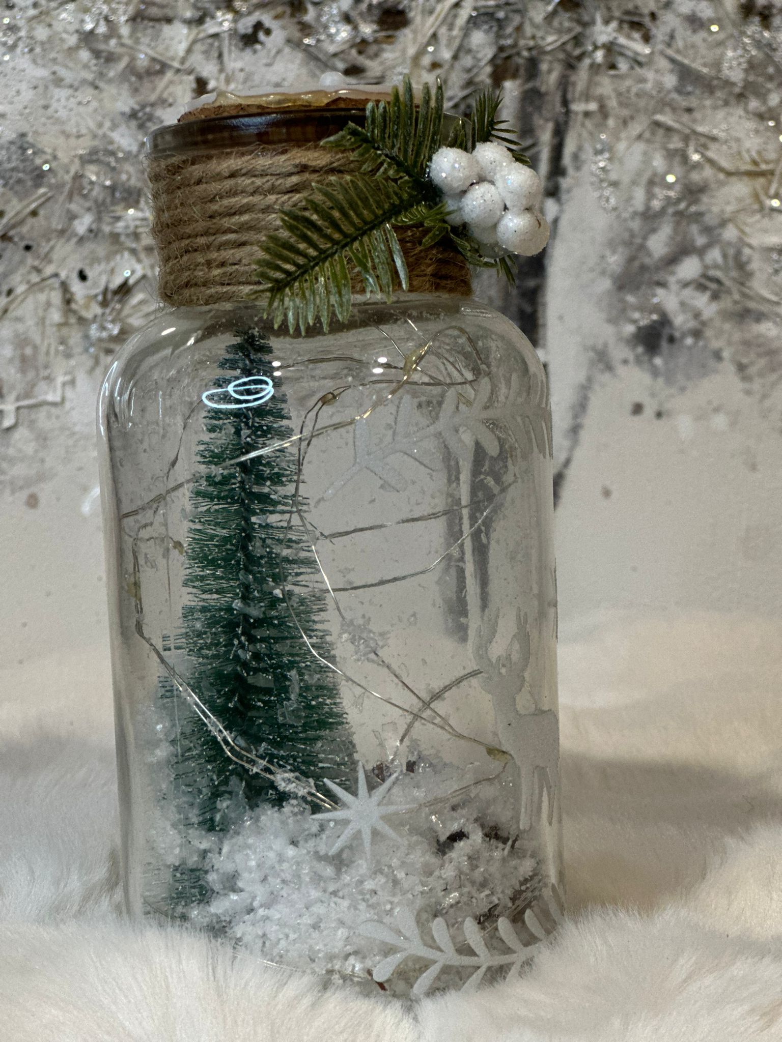 La superficie esterna di ciascuna bottiglia è decorata con un'immagine di cervo bianco stilizzato, incorniciato da motivi vegetali e stelle, che contribuiscono a creare un'atmosfera natalizia e naturale. All'interno, si possono vedere lucine led ed alberelli di pino innevati. I coperchi sono abbelliti con ramoscelli di pino sintetici e piccoli grappoli di bacche bianche, che sono legati intorno al bordo superiore, creando un effetto rustico e naturale. Questa decorazione vegetale aggiunge un ulteriore tocco natalizio ai barattoli, richiamando la bellezza della natura in inverno.