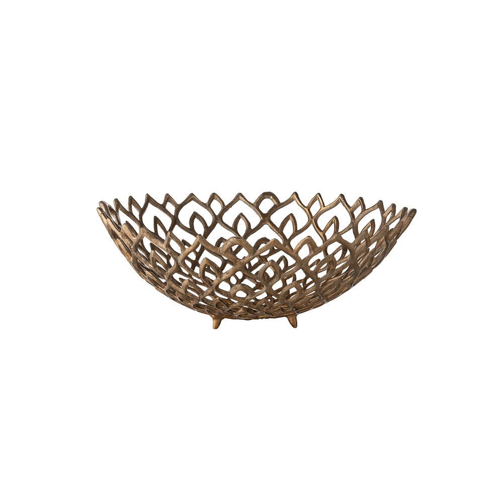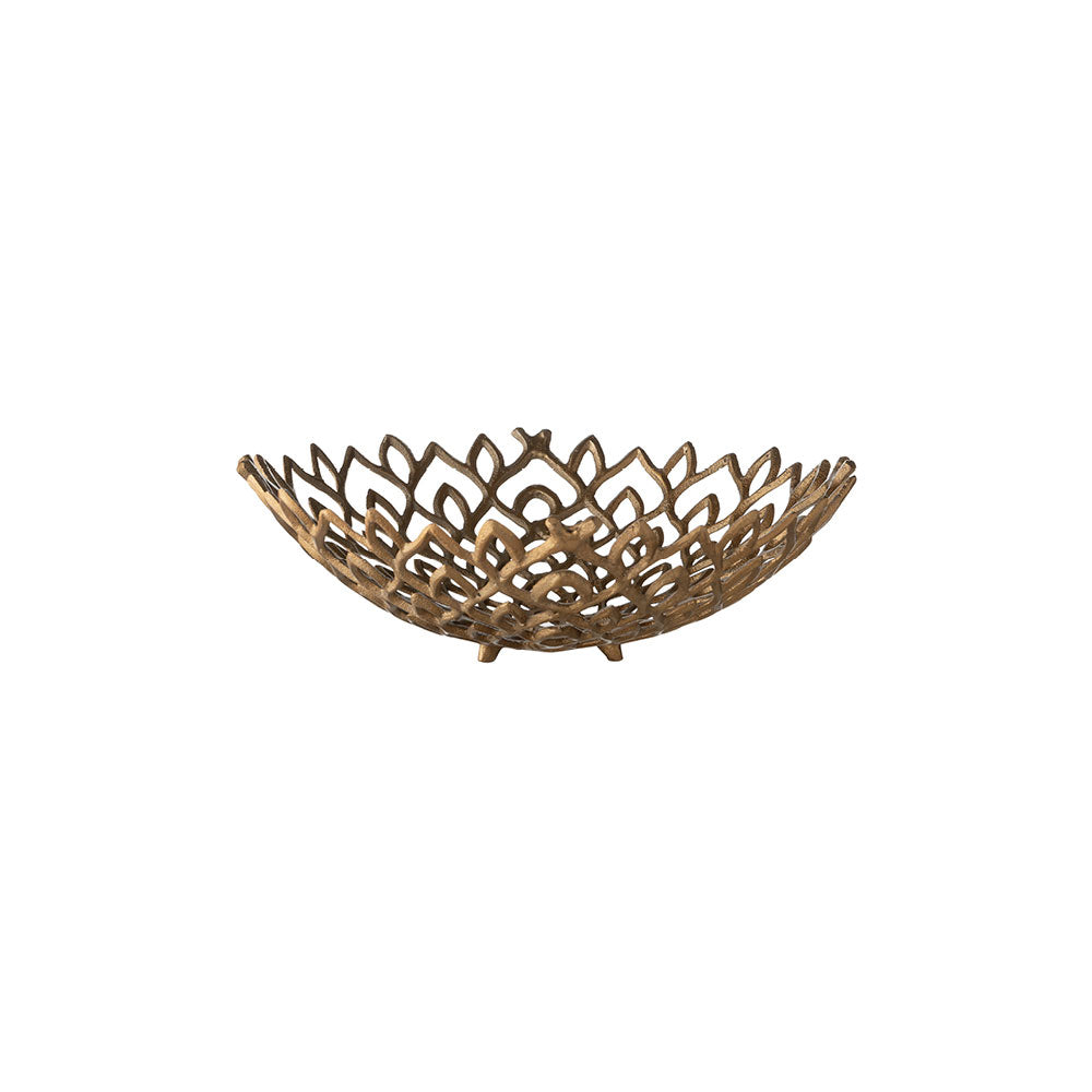 Centrotavola traforato in ottone che trasforma ogni tavola in uno spazio di pura eleganza. I dettagli traforati creano un gioco di luci affascinante, mentre la struttura in ottone garantisce solidità e una brillantezza che resiste nel tempo. Disponibile in due dimensioni—piccola (34x34x10 cm) e grande (36x36x13 cm)—si adatta perfettamente a qualsiasi composizione. Un pezzo senza tempo che eleva pranzi e cene, aggiungendo raffinatezza e personalità al tuo arredamento.