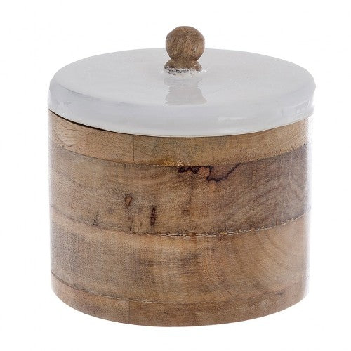 Contenitore in legno con tappo in legno e smalto bianco, dalla forma circolare. Perfetto per contenere piccoli oggetti e decorare consolle o angoli della casa, aggiungendo un tocco di stile country e di charme. Elegante e pratico, si integra armoniosamente in ambienti raffinati e accoglienti