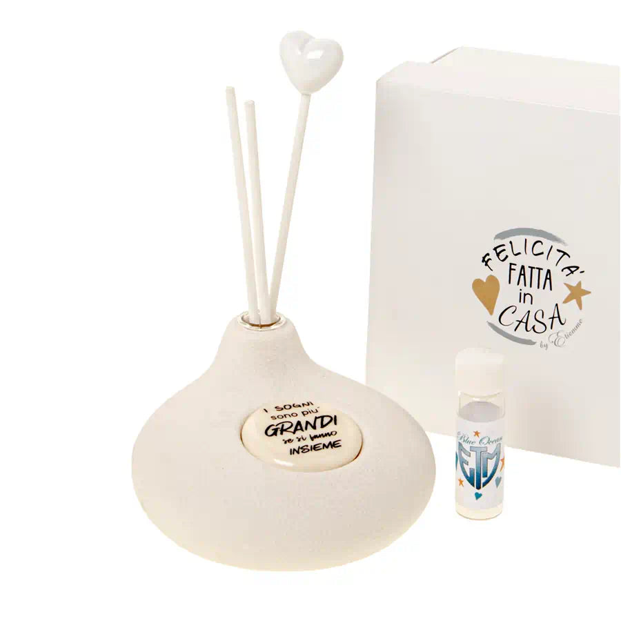 Questo diffusore ambiente unisce eleganza e funzionalità: i bastoncini diffondono delicatamente la fragranza, mentre il cuore in ceramica posizionato sopra aggiunge un tocco raffinato e romantico. La scritta sul diffusore completa il design, rendendolo un elemento decorativo ideale per creare un’atmosfera accogliente e sofisticata in ogni ambiente.