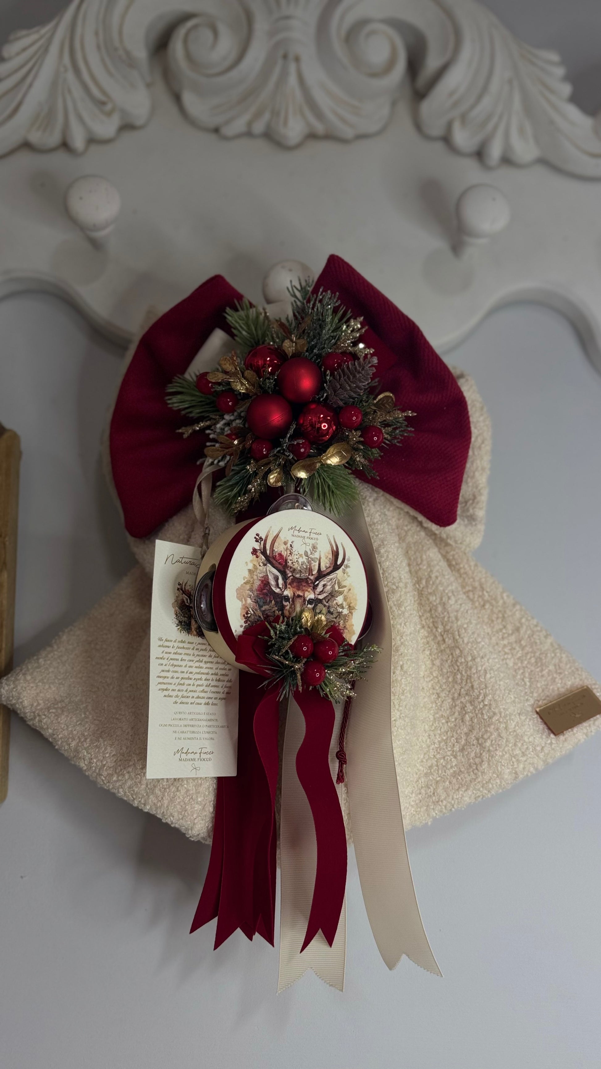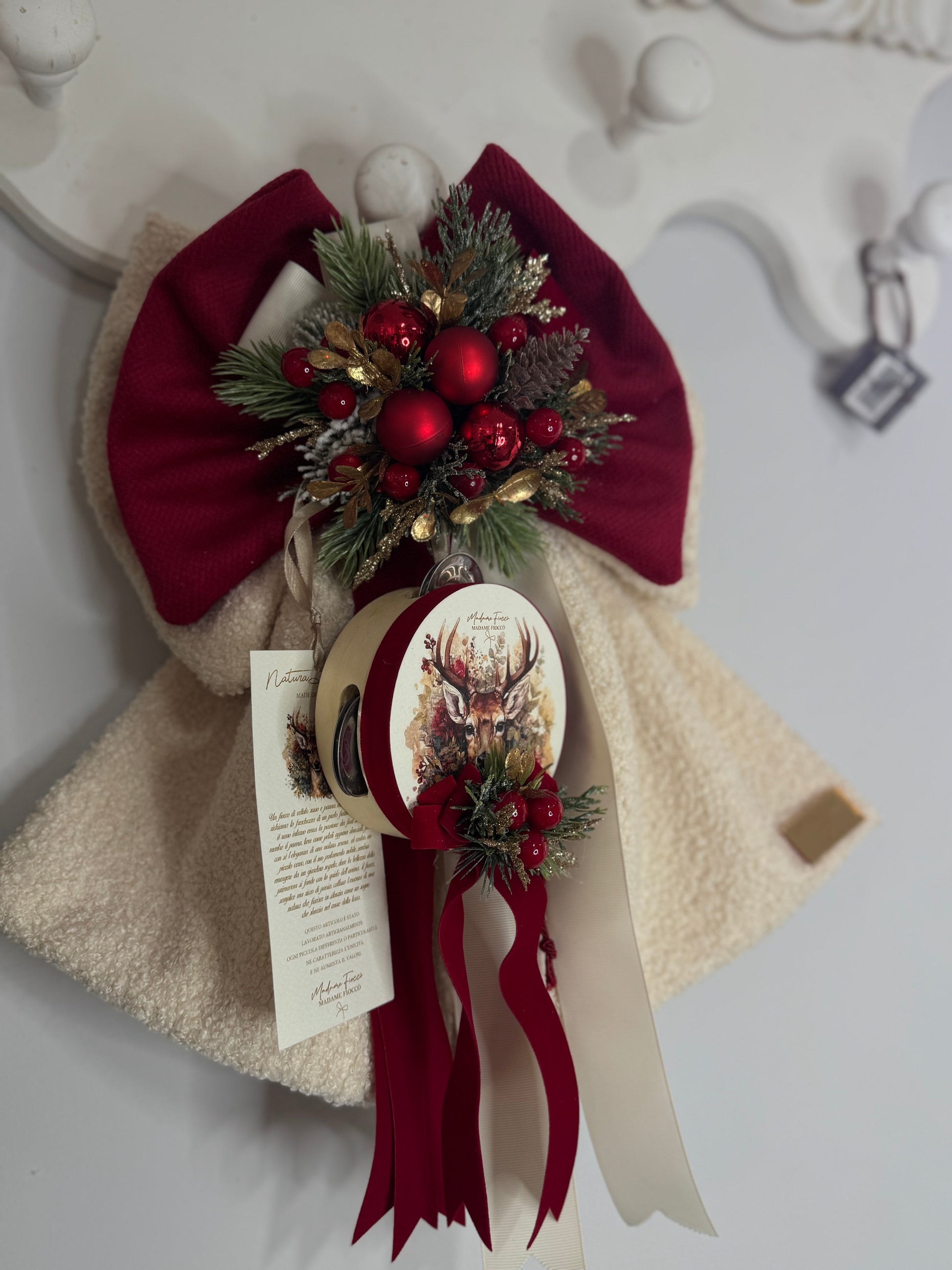 Questo elegante fiocco decorato con un tamburello aggiunge un tocco unico e raffinato a ogni ambiente. Con un'altezza di 40 cm, si presta perfettamente a evidenziare dettagli con stile e personalità, rendendo ogni spazio più accogliente e originale. Ideale per chi cerca un complemento decorativo di carattere e qualità.