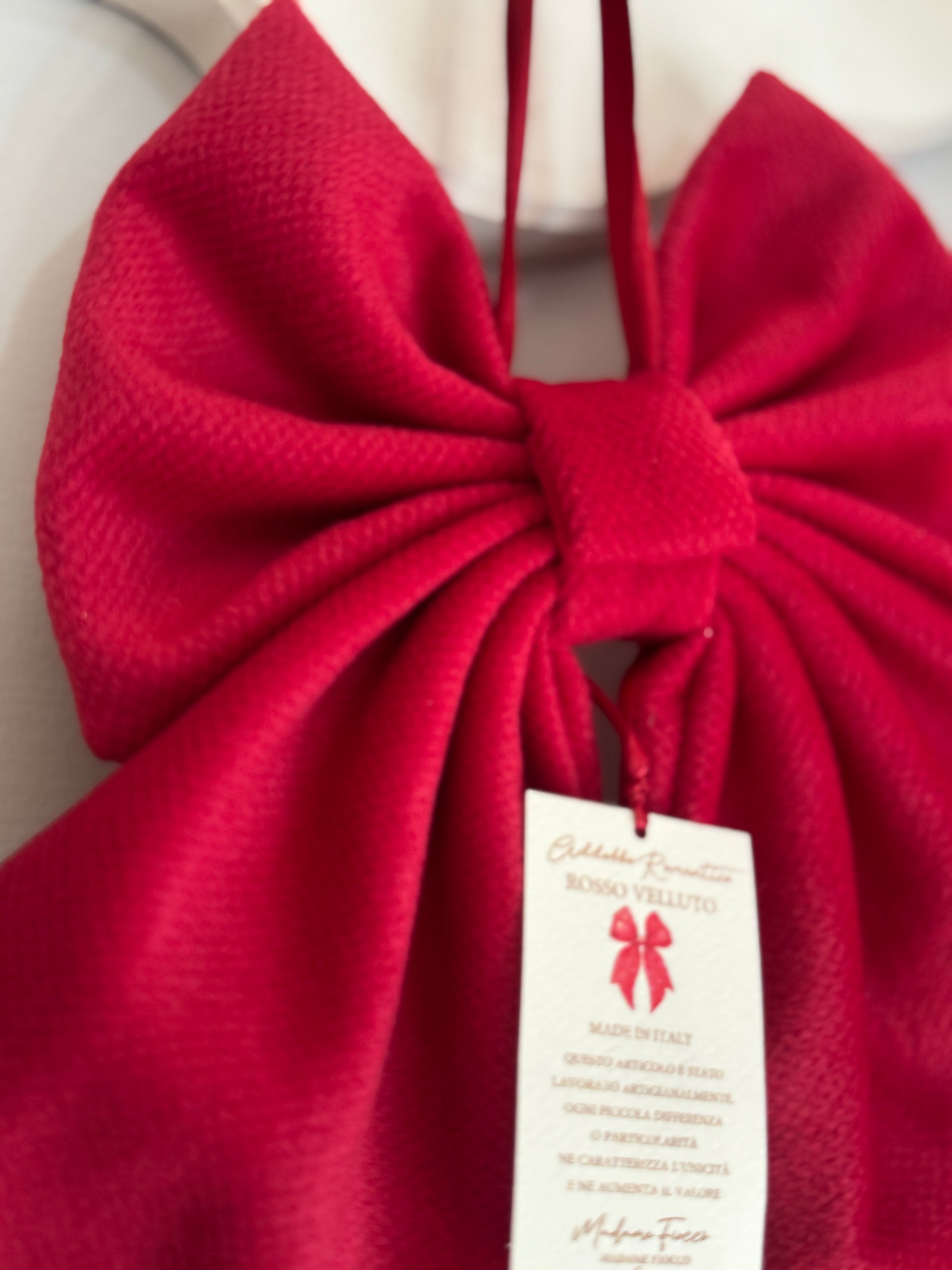 Questo fiocco rosso in tessuto, lungo 30 cm, è l’accessorio ideale per aggiungere un tocco elegante e vivace a ogni ambiente o regalo. Realizzato con materiali di qualità, si presenta resistente e perfetto per decorazioni bomboniere, confezioni regalo o dettagli d’arredo. Dona un tocco di calore e stile con semplicità, trasformando ogni occasione in un momento speciale.