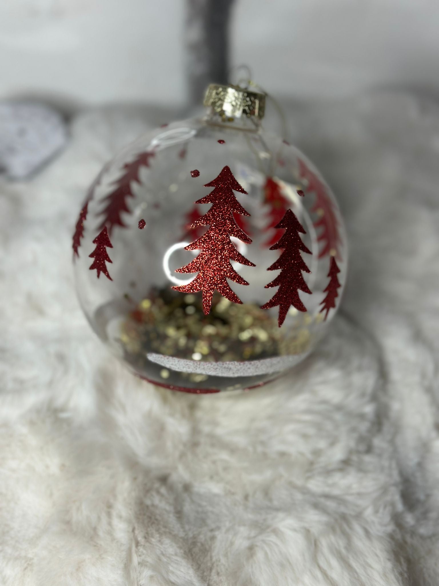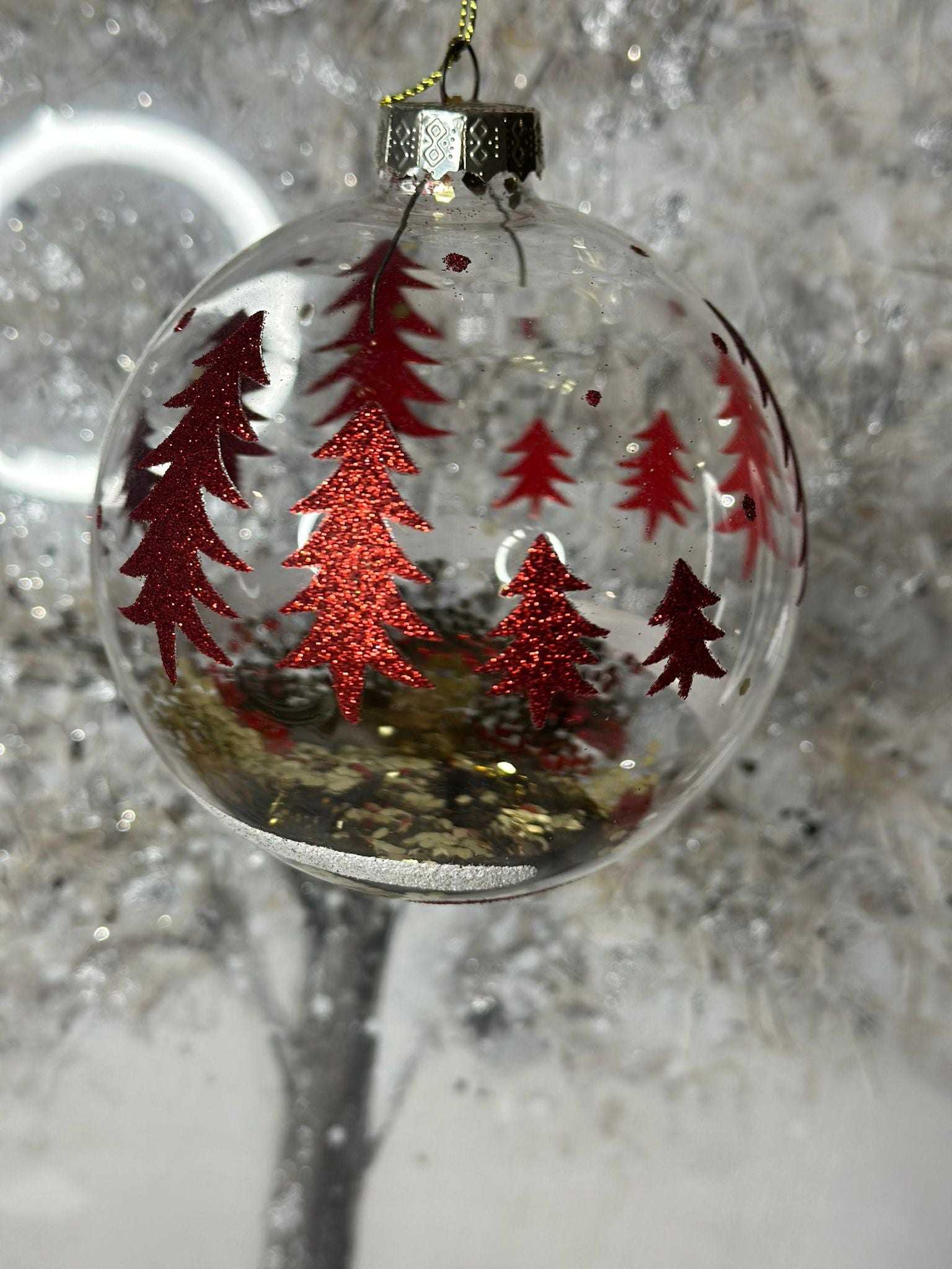 PALLA DI NATALE TRASPARENTE CON DECORO ROSSO E ORO
