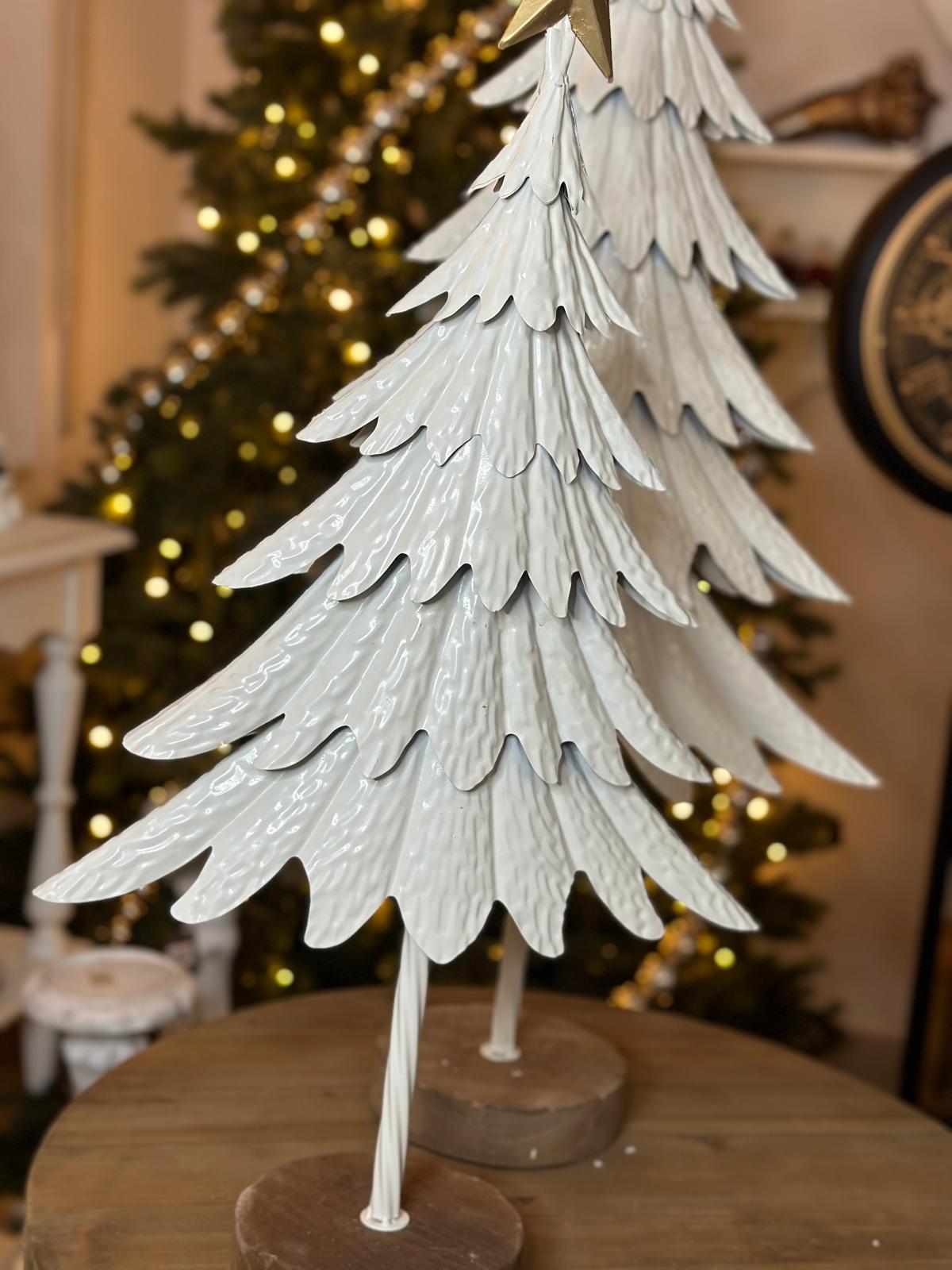 Albero di Natale bianco, in metallo, con piccola base in legno . Ha un aspetto a lamelle, con piccole foglie/rami che formano la forma dell'albero. La sua superficie è liscia e opaca, di colore bianco. In cima all'albero c'è una stella dorata. Perfetto per decorare qualsiasi spazio durante le festività natalizie.