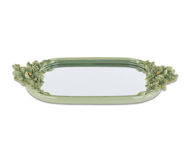 Esalta ogni ambiente con questo raffinato vassoio decorativo, caratterizzato da uno specchio incorniciato da motivi floreali verdi e dorati. Perfetto per valorizzare i tuoi oggetti più preziosi o per un tocco di eleganza sulle tavole e i mobili, questo vassoio combina funzionalità e stile, rendendo ogni dettaglio un piacere per gli occhi. Un complemento ideale per chi cerca classe e originalità in un unico pezzo.