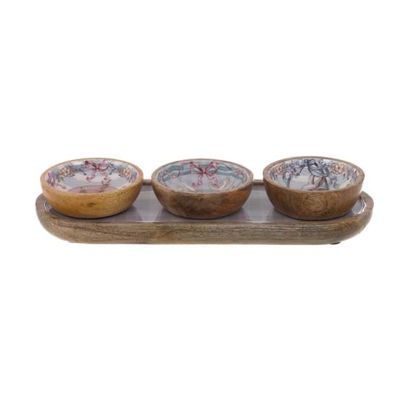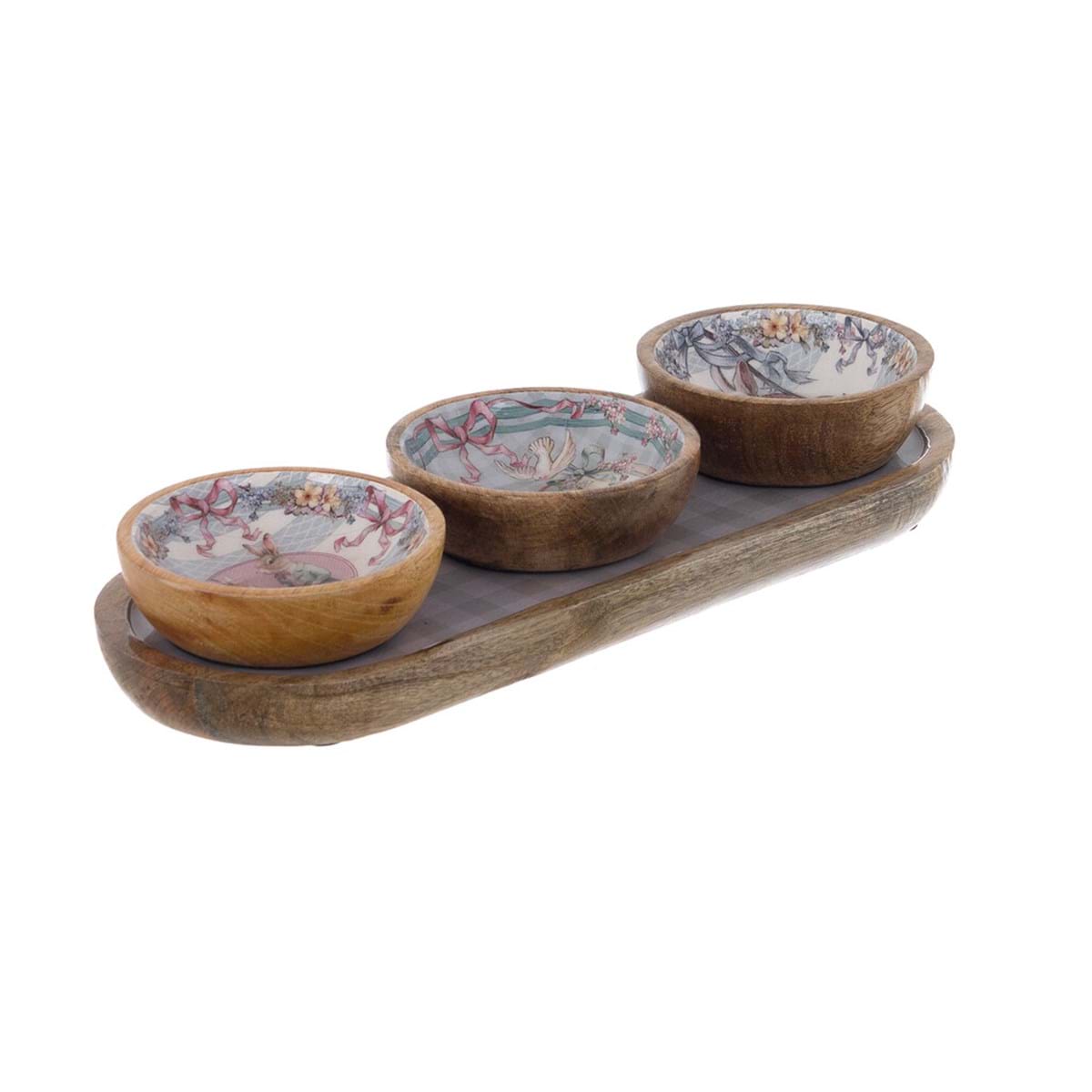 Vassoio in legno di mango della collezione Joyeuses Pâques, elegante soluzione per la tavola pasquale. Misure 33 x 12 x 6 cm. Completo di tre salsiere in tonalità rosa e celesti, perfetto per servire condimenti e salse durante le festività. Il legno naturale garantisce durabilità e un'estetica raffinata, mentre il design coordinato crea un'atmosfera festosa e armoniosa. Ideale per chi apprezza dettagli curati e funzionalità nel servizio da tavola.